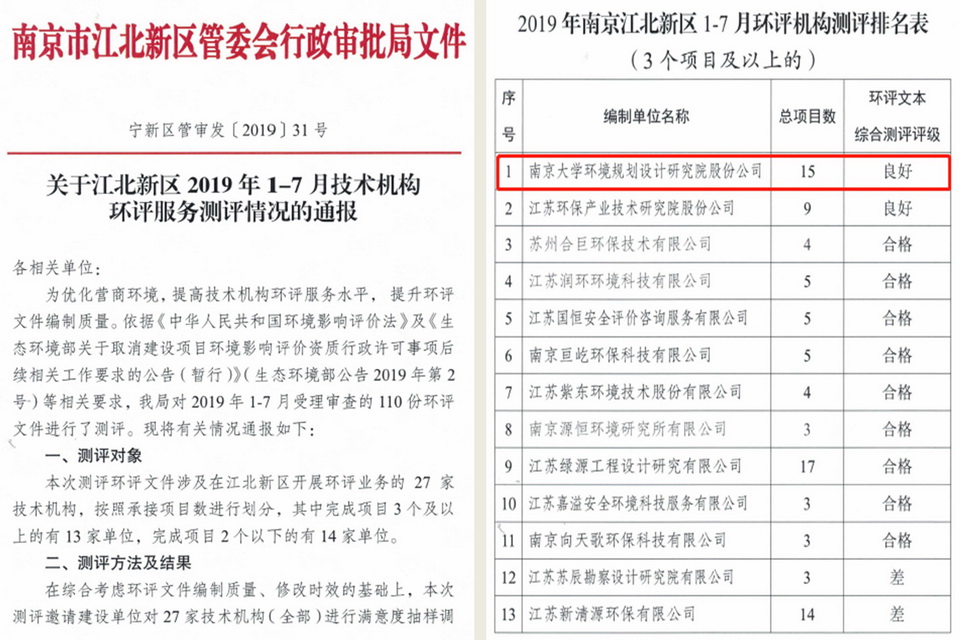 環(huán)評業(yè)務連續(xù)兩年在江北新區(qū)測評中拔得頭籌