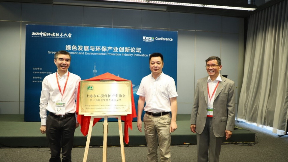柏總發言結束后,上海市環保協會長三角綠色發展專業委員會的揭牌儀式隆重舉行,儀式由上海市環境保護產業協會秘書長楊建生主持,特邀柏國強總工程師與楊文敏副組長共同揭牌。