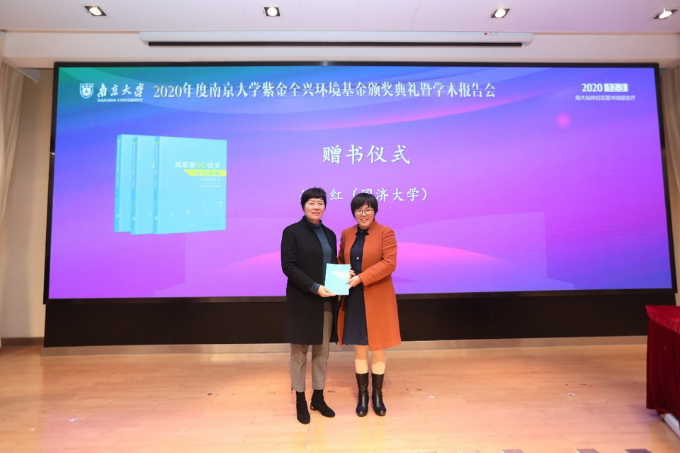 作為獲獎人員代表,青年學者獎獲獎者關小紅教授在感言中表達了對南京大學紫金全興環境基金管理委員會及張全興院士的衷心感謝,表示自己將不忘初心,不斷前行,為營造良好的科研氛圍而繼續努力。同時,她向南大環境學院捐贈了100本自己編寫的《高質量SCI論文入門必備》,希望盡自己所能反哺基金,讓更多在科研道路上努力前行的學生能夠獲益,劉建萍書記作為學院代表接受了贈書。