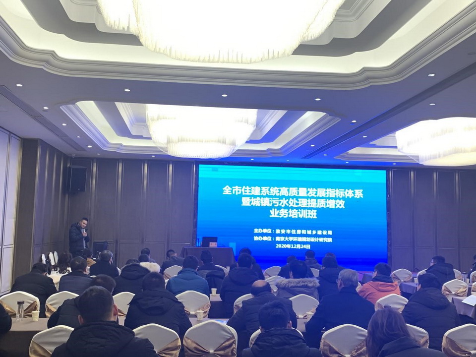 12月23日-24日,由淮安市住建局主辦、南大環規院集團承辦的全市住建系統高質量發展體系暨城鎮污水處理提質增效業務培訓班在淮安市順利召開。市住建局黨委書記、局長秦浩出席開班儀式并作動員講話,省住建廳計財處處長王佳劍、南京市水務局總工程師駱穎等行業專家受邀授課,市住建局相關處室單位領導、各縣區住建局主要領導、分管領導及相關業務科室負責人等120余人參加培訓學習,活動由集團工程設計分院工程設計三所所長楊潑主持。