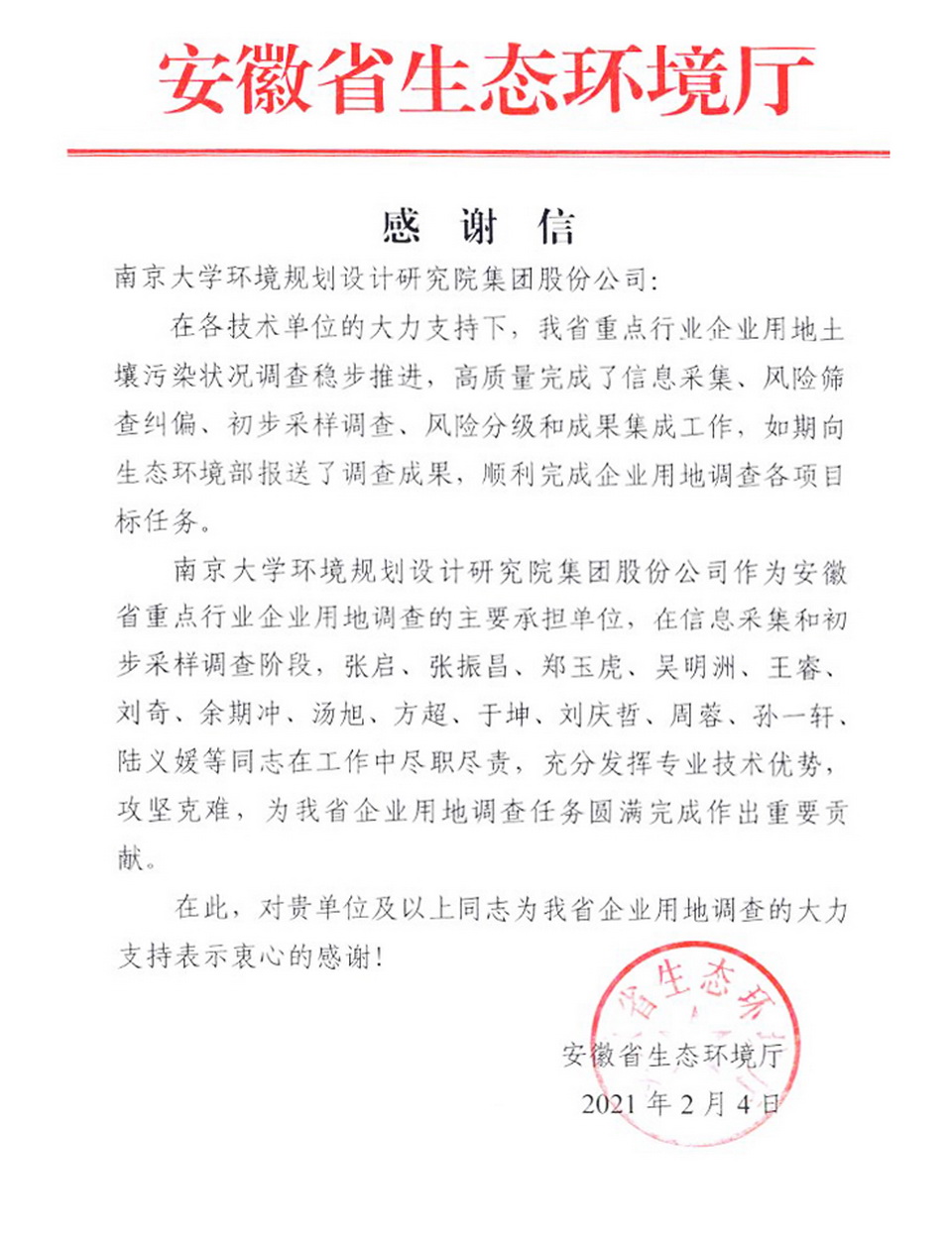 近日,安徽省生態環境廳向南大環規院集團寄來一封熱情洋溢的感謝信,對集團張啟、張振昌、鄭玉虎、吳明洲、王睿、劉奇、余期沖、湯旭、方超、于坤、劉慶哲、周蓉、孫一軒、陸義媛等14名技術專家表示感謝,感謝他們為全省重點行業企業用地調查工作做出的重要貢獻。