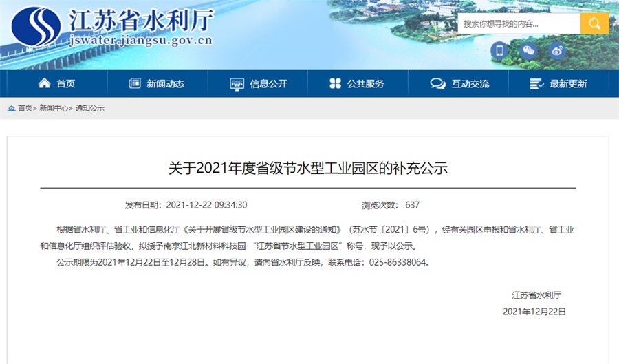 南京江北新材料科技園是南京市唯一以發展現代化工為主的工業園區,用水總量大,是節水的重點和難點區域。該項目是集團首次承接并獲得省市高度認可的節水型園區創建項目。項目團隊在充分調研園區104家工業企業新鮮水、排放水、回用水、非常規水等大量數據的基礎上,對園區企業節水技術改造、節水管理創新等方面深入挖掘,通過多輪內部討論、省市級專家咨詢,2021年9月通過市級初審,2021年12月通過省級驗收。2021年12月22日江蘇省水利廳發布公示授予南京江北新材料科技園“江蘇省節水型工業園區”稱號。