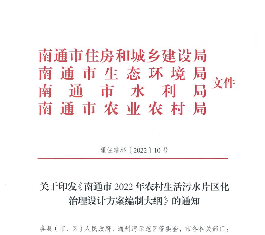 2022年1月19日,南通市住建局、生態環境局、水利局、農業農村局四部門聯合印發了《2022年農村生活污水片區化治理設計方案編制大綱》。該文件由南大環規院集團工程設計分院市政工程所主持編制,從宏觀層面上規范了治理思路和設計方案,并率先提出了農污治理效益評估的概念,助力全市鄉村振興工作。