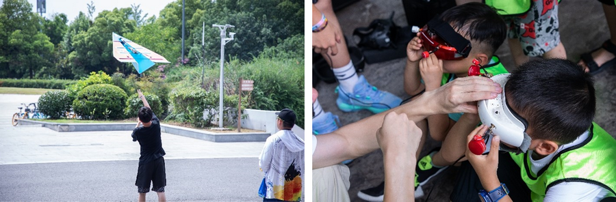 理論課程結(jié)束后,大朋友和小朋友一起來到湖濱廣場,欣賞專業(yè)飛手帶來的飛行秀。下午兩點似火的驕陽完全抵擋不住大家的熱情,穿越機與固定翼上演空中追逐競賽,在無人機的呼嘯聲和大家的拍手叫好聲中,現(xiàn)場的氣氛再一次達到了巔峰,臨時抽取的幸運觀眾還戴上FPV眼鏡感受了第一人稱視角的穿越飛行,獲得了一次難得的體驗。
