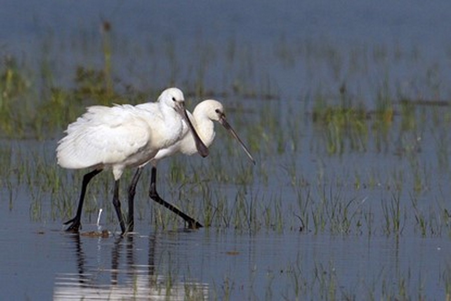白琵鷺為大型涉禽,因嘴部形狀似“琵琶”而得名,喜涉水覓食魚、蛙、軟體動物等動物性食物,在覓食時白琵鷺喜將“琵琶”狀喙伸入潛水中左右掃蕩,碰到魚類、蠕蟲、螃蟹等食物時即可將其捕獲。在江蘇白琵鷺為冬候鳥,冬季一般見于江蘇濱海灘涂及內陸湖泊的淺水灘內。