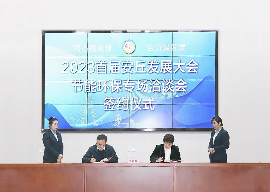 2023年4月4日,南大環規院受邀參加2023首屆安丘發展大會及節能環保專場洽談會,安丘市委書記賈勤清出席洽談會并講話,集團常務副總裁吳俊鋒與安丘市委常委、副市長王曉麗代表雙方簽訂了戰略合作協議,會議由安丘市委副書記譚明主持。