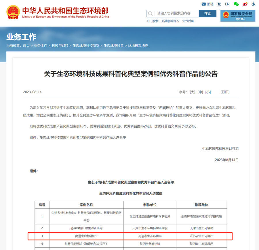 近日,生態環境部科技與財務司公告了“生態環境科技成果科普化典型案例和優秀科普作品”。由江蘇省生態環境廳指導、南通市生態環境局委托、南大環規院自然生態所和大氣環境與信息化研究所聯合設計開發的“南通生物臉譜APP”,喜獲十佳典型案例。