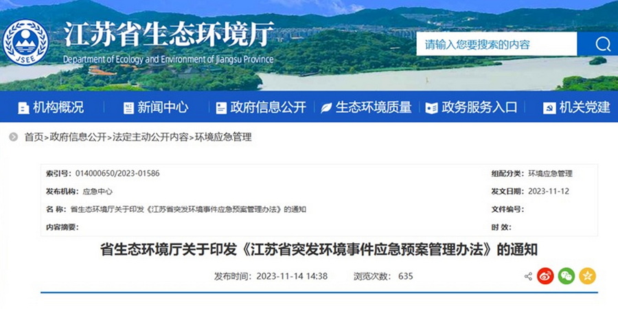 《江蘇省突發(fā)環(huán)境事件應急預案管理辦法》正式印發(fā)