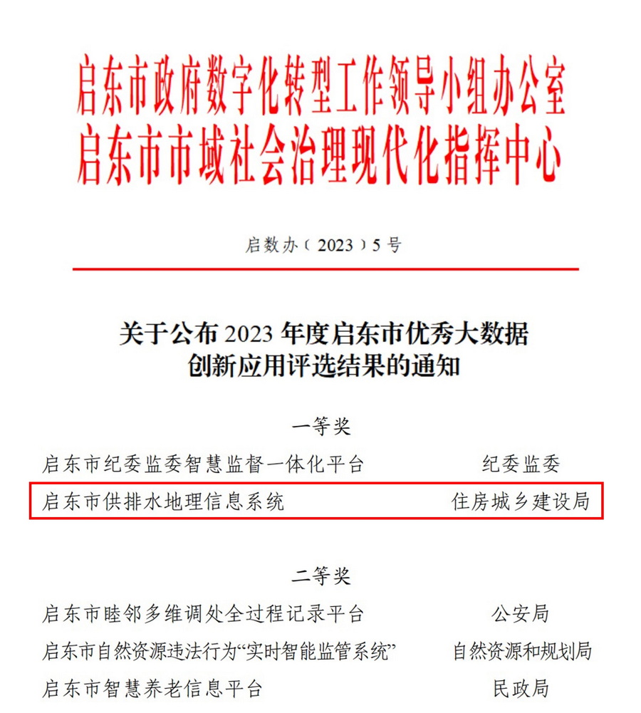 近期,啟東市政府?dāng)?shù)字化轉(zhuǎn)型工作領(lǐng)導(dǎo)小組辦公室、市域社會治理現(xiàn)代化指揮中心聯(lián)合公布了2023年度啟東市優(yōu)秀大數(shù)據(jù)創(chuàng)新應(yīng)用評選結(jié)果,南大環(huán)規(guī)院承建的啟東市供排水地理信息系統(tǒng)喜獲一等獎。
