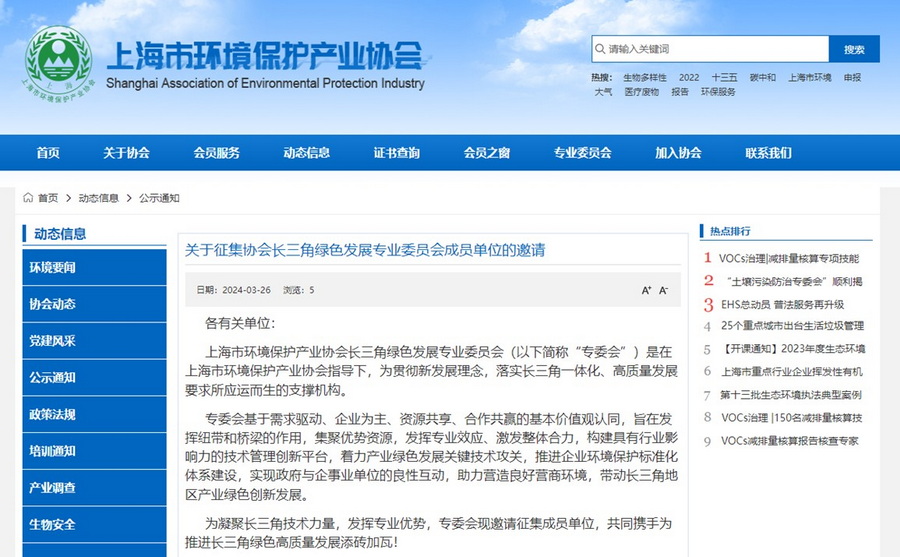 上海市環境保護產業協會長三角綠色發展專業委員會是在協會指導下,為貫徹新發展理念,落實長三角一體化發展戰略,所應運而生的專業支撐機構。為凝聚長三角技術力量,發揮專業優勢,專委會現邀請征集成員單位,共同攜手為推進長三角綠色高質量發展添磚加瓦!