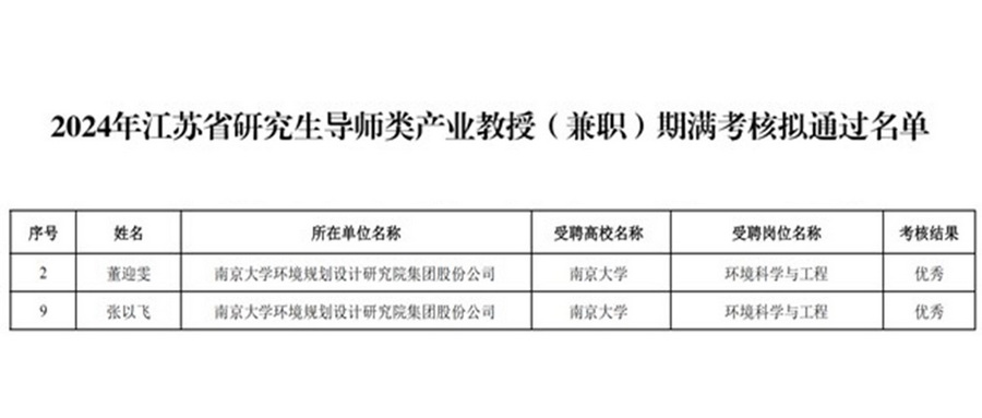 近日,江蘇省教育廳公布了2024年江蘇省研究生導(dǎo)師類產(chǎn)業(yè)教授期滿考核結(jié)果,南大環(huán)規(guī)院張以飛、董迎雯兩位老師包攬了南京大學(xué)11位受聘導(dǎo)師中的兩個(gè)“優(yōu)秀”評價(jià)。