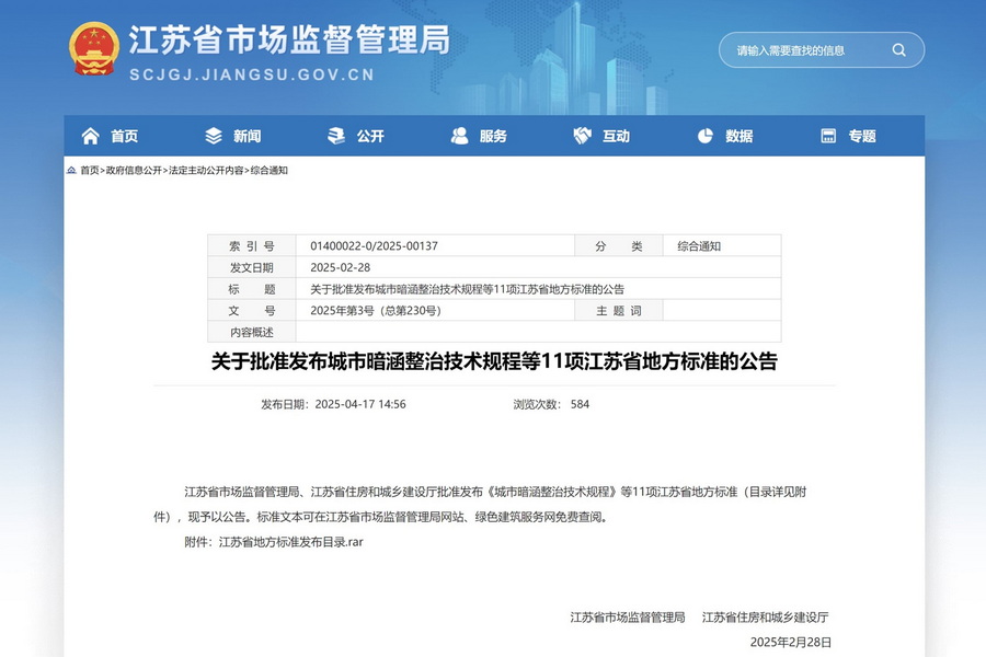 近日,江蘇省市場監督管理局、江蘇省住房和城鄉建設廳批準發布《城市暗涵整治技術規程》(DB32/T 5077-2025),該項標準由南大環規院工程設計研究院主持編制,將于2025年9月1日正式實施。