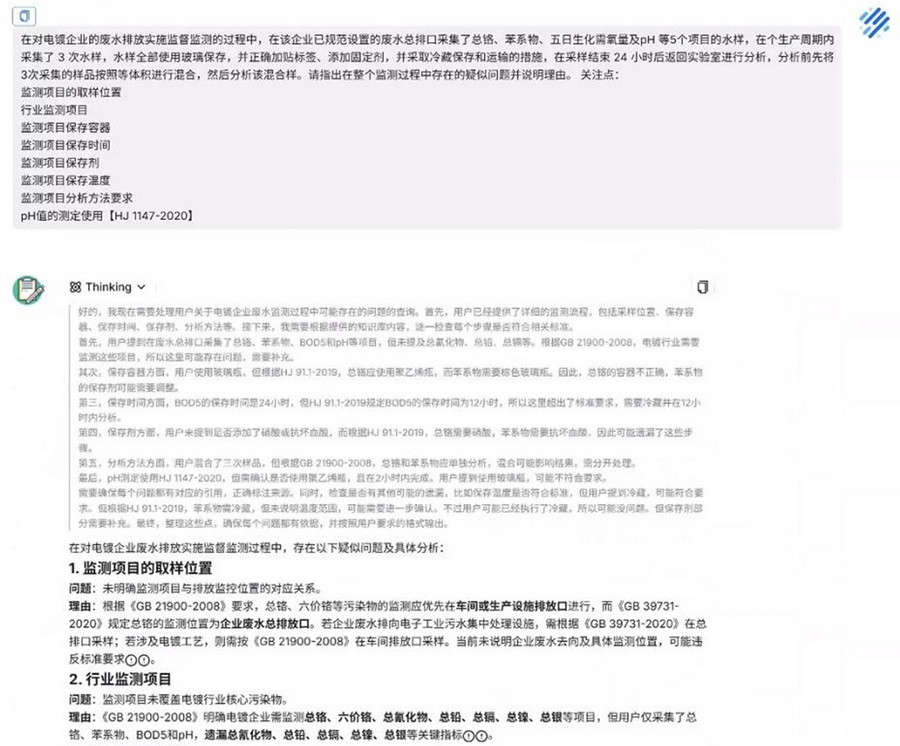 依托對大模型與環保業務融合的前期研究,南大環規院完成了系統的本地化部署,開發了簡潔友好的前端交互界面。系統在內網環境下運行,無需聯網,嚴格滿足競賽對信息安全的要求。選手可通過自然語言提問,系統即時從本地知識庫中檢索權威依據,輔助判斷監測報告的合規性。